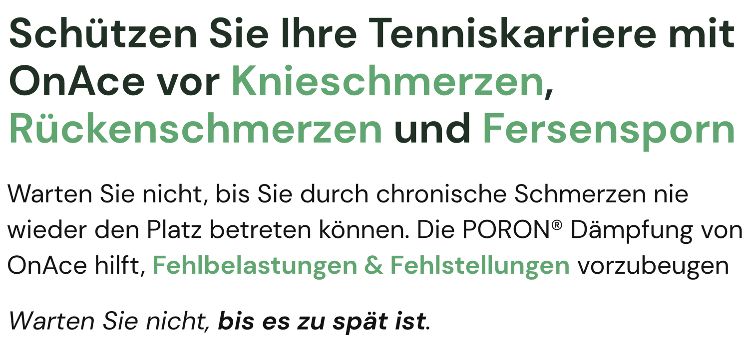 Ich gebe jedes Jahr hunderte Euro für neue Schläger, Saiten und Schuhe aus, aber Einlegesohlen? Daran hab ich nie gedacht. Großer Fehler. Ich hatte keine akuten Schmerzen, aber nach längeren Matches immer so ein „müdes" Gefühl in den Beinen und manchmal leichte Knieschmerzen. Mit OnAce fühle ich mich einfach frischer auf dem Platz – als würde ich auf Wolken laufen. Meine Reaktionszeit ist besser, weil ich mich sicherer bewege, und ich kann länger auf hohem Niveau spielen. Klingt vielleicht übertrieben, aber das ist das beste Equipment-Upgrade, das ich dieses Jahr gemacht habe. Und das für unter 60€. Jeder, der Tennis ernst nimmt, sollte sich das holen. Ich gebe jedes Jahr hunderte Euro für neue Schläger, Saiten und Schuhe aus, aber Einlegesohlen? Daran hab ich nie gedacht.... Ich gebe jedes Jahr hunderte Euro für neue Schläger, Saiten und Schuhe aus, aber Einlegesohlen? Daran hab ich nie gedacht. Großer Fehler. Ich hatte keine akuten Schmerzen, aber nach längeren Matches immer so ein „müdes" Gefühl in den Beinen und manchmal leichte Knieschmerzen. Mit OnAce fühle ich mich einfach frischer auf dem Platz – als würde ich auf Wolken laufen. Meine Reaktionszeit ist besser, weil ich mich sicherer bewege, und ich kann länger auf hohem Niveau spielen. Klingt vielleicht übertrieben, aber das ist das beste Equipment-Upgrade, das ich dieses Jahr gemacht habe. Und das für unter 60€. Jeder, der Tennis ernst nimmt, sollte sich das holen.